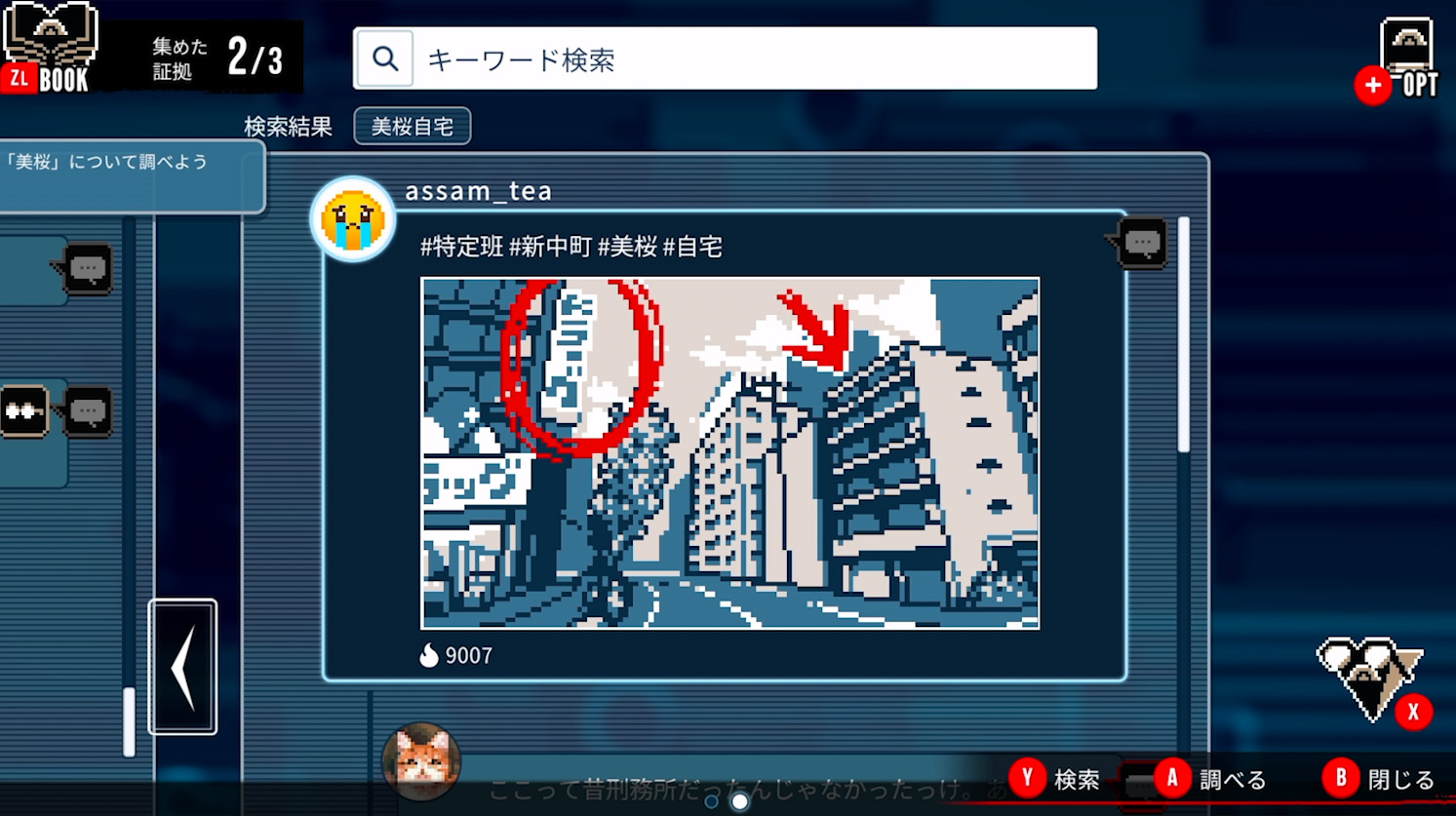 SNSで調査していると依頼者の友人がSNSにアップしていて、その投稿がバズっていて話題になっている・・・SNS調査ではこの噂の出所を探して、情報収集をすることから始まるみたいです!本当になんかの探偵みたいでおもろい📱そしてちょっとした写真を上げるだけで家まで特定されるような描写もあって、SNSって本当に怖いわ〜と思いながら調査していました(#特定班とかリアル)。このゲームを通してSNSの怖さとか向き合い方まで教えてもらっているような気がする😂